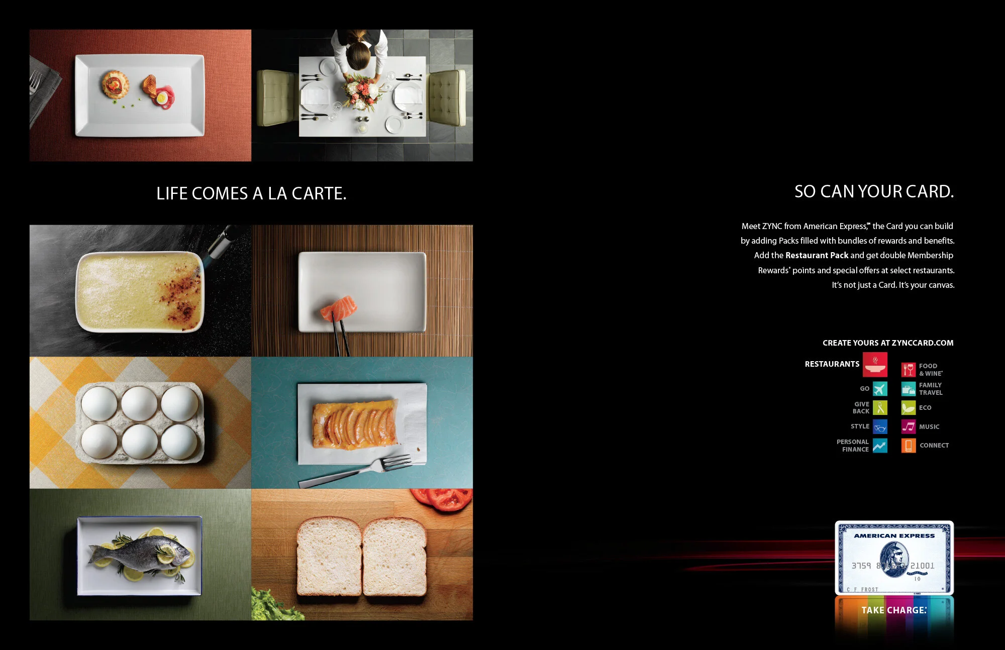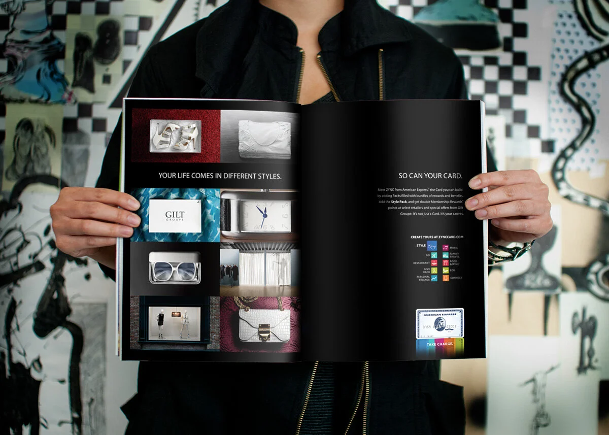 The customizable Zync Card has benefits that are organized into groups, called packs, based on your interests. These print ads use a simple rectangular aesthetic that visually represent blank canvases that correspond with the shape of the card and it’s features. Shot by Ed James and featured in Archive Magazine as well as some other publications.